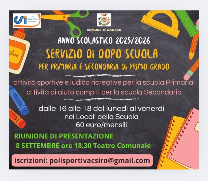 La Polisportiva CSI Rovigo e il Comune di Canaro propongono per l’anno scolastico 2025/2026 il servizio di doposcuola per la scuola primaria e secondaria di primo grado. Un’iniziativa che offre ai ragazzi della scuola primaria attività sportive e ludico ricreative, mentre i ragazzi delle secondaria saranno supportati nello svolgimento dei compiti. Il servizio sarà attivo dal lunedì al venerdì, dalle 16 alle 18, presso i locali della scuola, al costo di 60 euro mensili. La riunione di presentazione è fissata per l’8 settembre alle ore 18.30 presso il Teatro Comunale di Canaro.