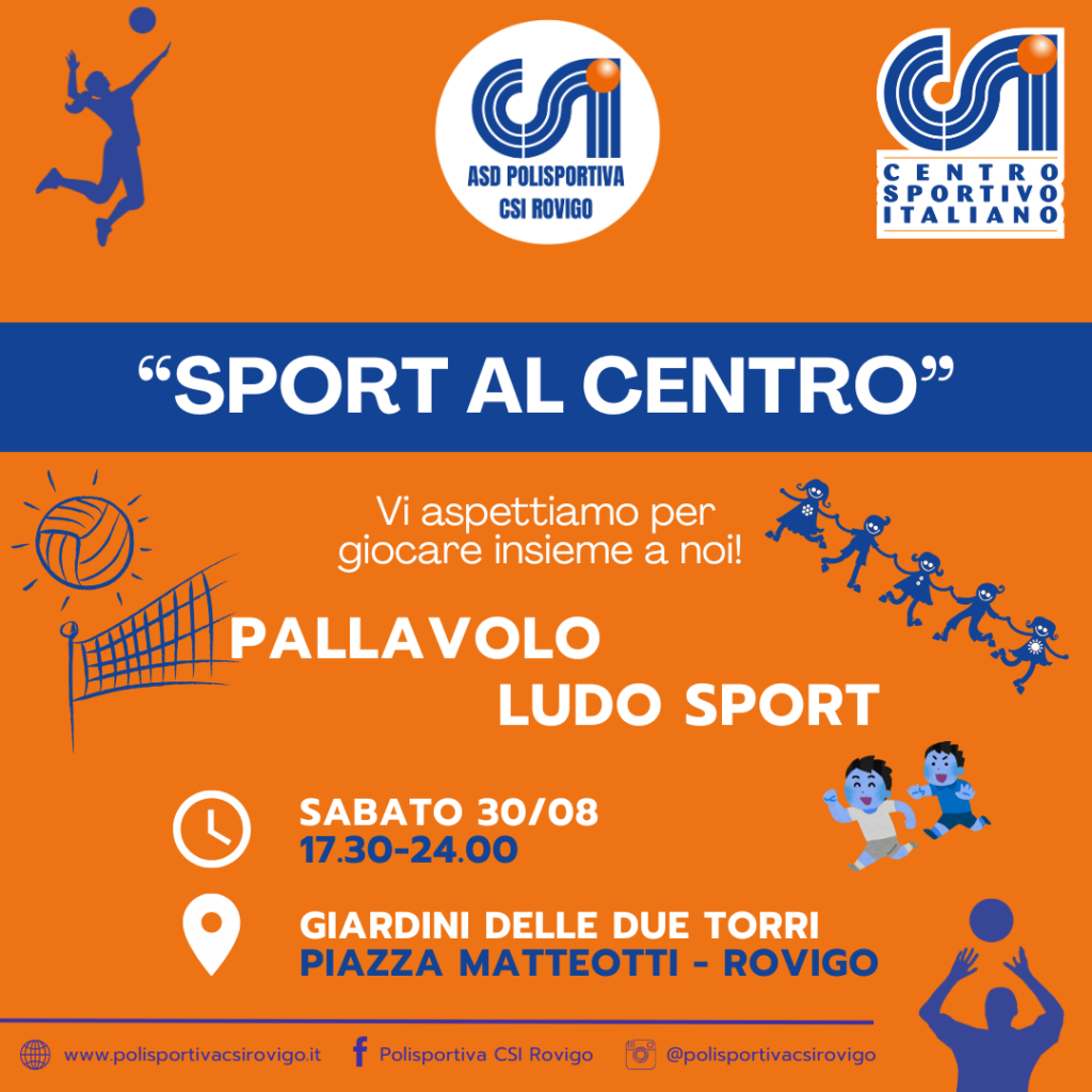 La Polisportiva CSI Rovigo ha partecipato con grande entusiasmo alla manifestazione “Sport al Centro” di sabato 30 agosto organizzata dal Comune di Rovigo, portando direttamente sui Giardini delle Due Torri tutte le sue attività sportive e ricreative, specialmente la pallavolo. Sono stati coinvolti tanti ragazzi e ragazze, con o senza esperienza, con un unico obiettivo comune: giocare e divertirsi insieme.
