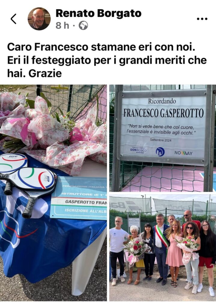Oggi 30 agosto, il Circolo Tennis Don Bosco di Rovigo ha reso omaggio a Francesco Gasperotto, storico maestro di tennis mancato lo scorso anno a soli 59 anni, inaugurando la “Gaspar Arena”, uno spazio che porterà per sempre il suo nome. Inoltre, lo stesso giorno, sono stati organizzati un torneo amatoriale e un open day di pickleball in sua memoria.